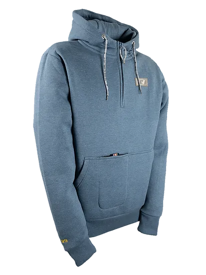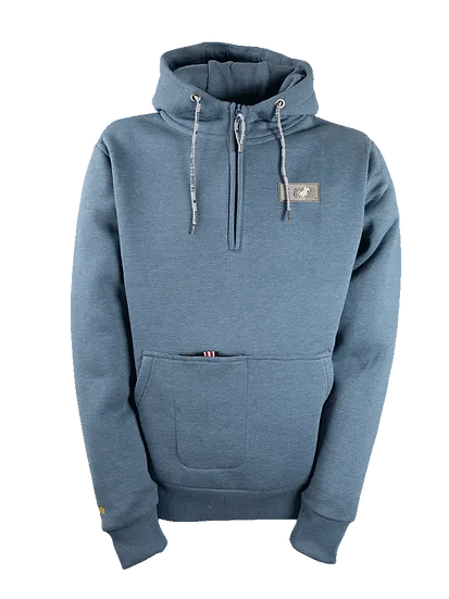 The OS Man Half-Zip Hooded Sweatshirt `BRENTON` melange-blue, is your new everyday companion with style. The sporty, straight cut not only offers comfort, but also ensures sufficient freedom of movement for western riding. Practical and well thought-out: the large kangaroo pocket offers space for your hands, and your cell phone is held securely in the integrated extra pocket. Finished with a modern silicone badge on the chest and high-quality embroidery on the back, this hoodie combines casual design with functionality. Perfect for anyone who appreciates comfort and style - whether riding or in everyday life.